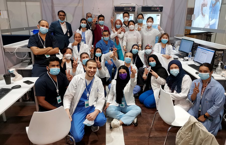 في الصورة الملتقطة يوم 12 أغسطس 2020، عاملون يلتقطون صورة جماعية في موقع للتطعيم باللقاحات في العاصمة الإماراتية أبو ظبي. وفي يونيو 2020، بدأت أول تجربة سريرية على مستوى العالم للمرحلة الثالثة من اللقاحات المعطلة المضادة لكوفيد-19 رسميا في الإمارات العربية المتحدة، وذلك بمقتضى اتفاق تعاون تم توقيعه من قبل المجموعة الوطنية الصينية للأدوية (سينوفارم) والإمارات.■