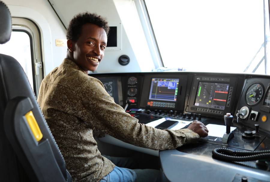 في عام 2016، افتتح خط سكة حديد أديس أبابا - جيبوتي، الذي تم بناؤه وتشغيله من قبل شركتين صينيتين. ويربط خط السكة الحديد هذا بين إثيوبيا وجيبوتي، وهو أول خط سكة حديد كهربائي ذي مسار قياسي وعابر للحدود في إفريقيا، حيث يساهم في تقصير وقت نقل البضائع بين البلدين وتسهيل السفر لسكانهما، إضافة إلى تحسين قدرة ميناء جيبوتي على التجميع والتوزيع. وتظهر هذه الصورة الملتقطة يوم 19 سبتمبر 2022 سائقًا محليًا يستعد داخل القطار قبل انطلاقه.