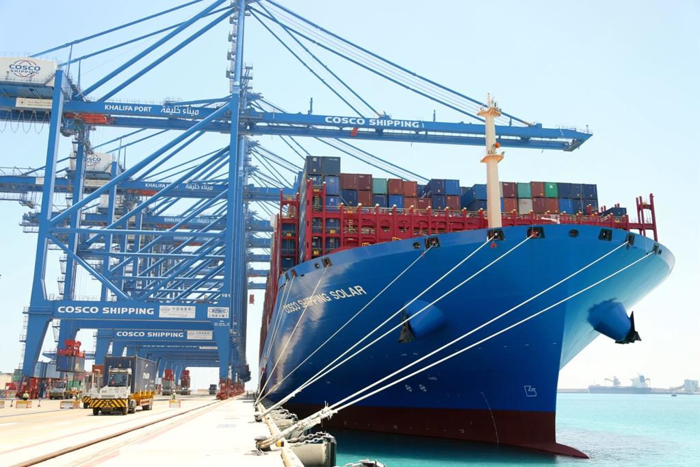 في الصورة الملتقطة يوم 25 مايو 2019، سفينة "كوسكو شيبينغ سولار" ترسو في محطة الحاويات. وفي 10 ديسمبر 2018، افتتحت محطة الحاويات للمرحلة الثانية لمشروع ميناء خليفة بأبو ظبي في الإمارات العربية المتحدة، والتي تديرها شركة كوسكو الصينية للملاحة، بالاشتراك مع هيئة موانئ أبو ظبي.