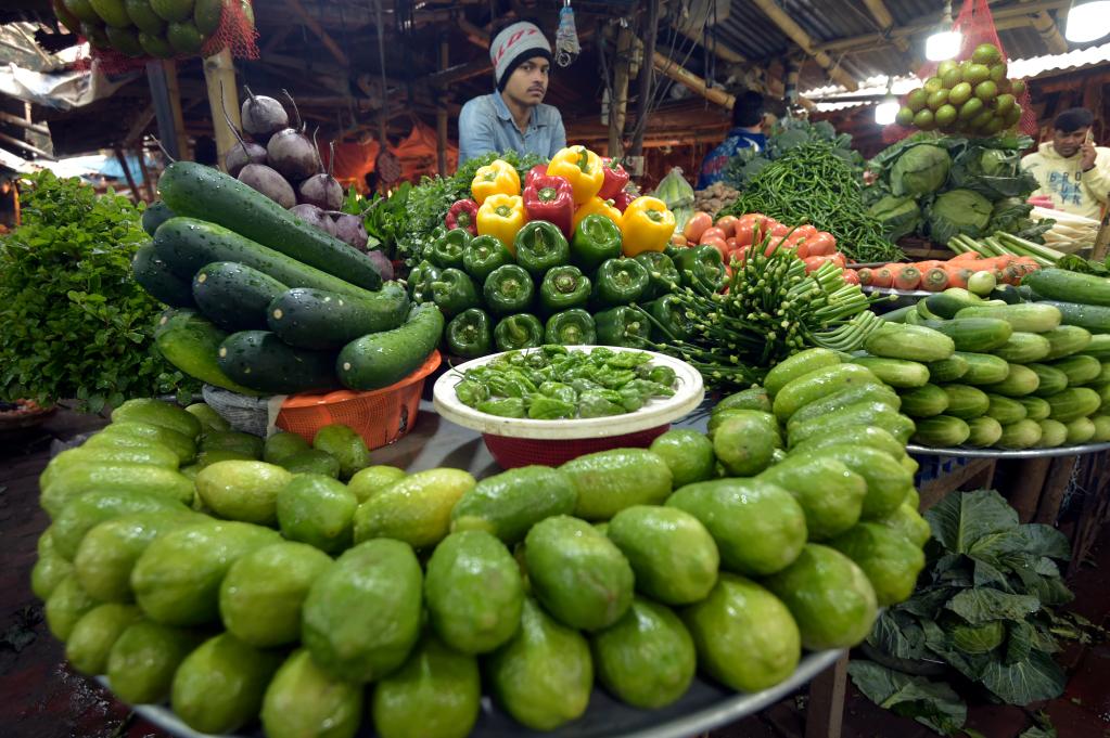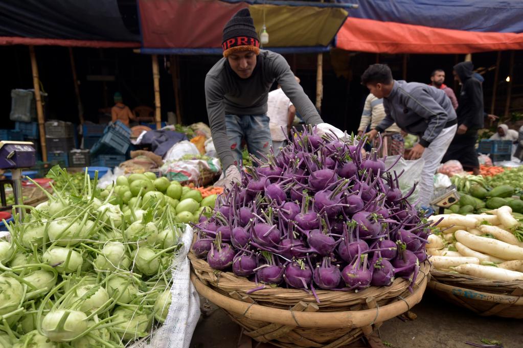 دكا 4 يناير 2023 (شينخوا) في الصورة الملتقطة يوم 3 يناير 2023، بائع يبيع الخضروات في سوق بدكا، عاصمة بنجلاديش.