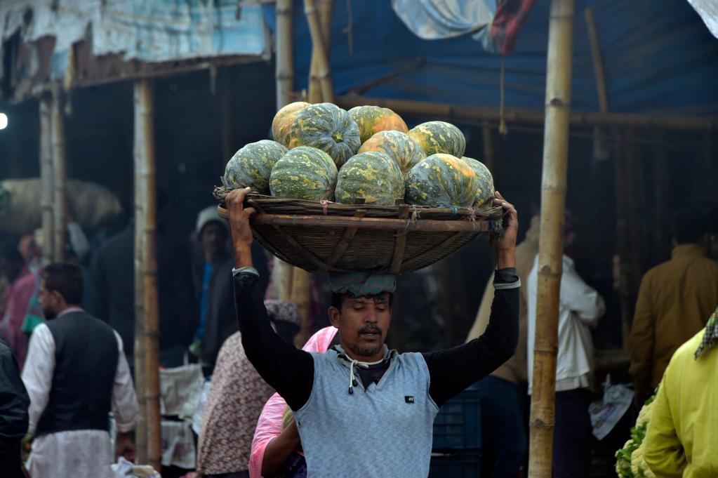 دكا 4 يناير 2023 (شينخوا) في الصورة الملتقطة يوم 3 يناير 2023، رجل يحمل سلة بها يقطين محصود حديثا في سوق بدكا، عاصمة بنجلاديش.