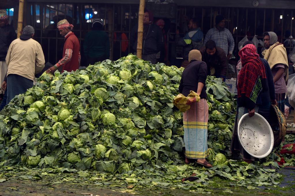 دكا 4 يناير 2023 (شينخوا) في الصورة الملتقطة يوم 3 يناير 2023، بائعون يعالجون خضروات محصودة حديثا في سوق بدكا، عاصمة بنجلاديش.