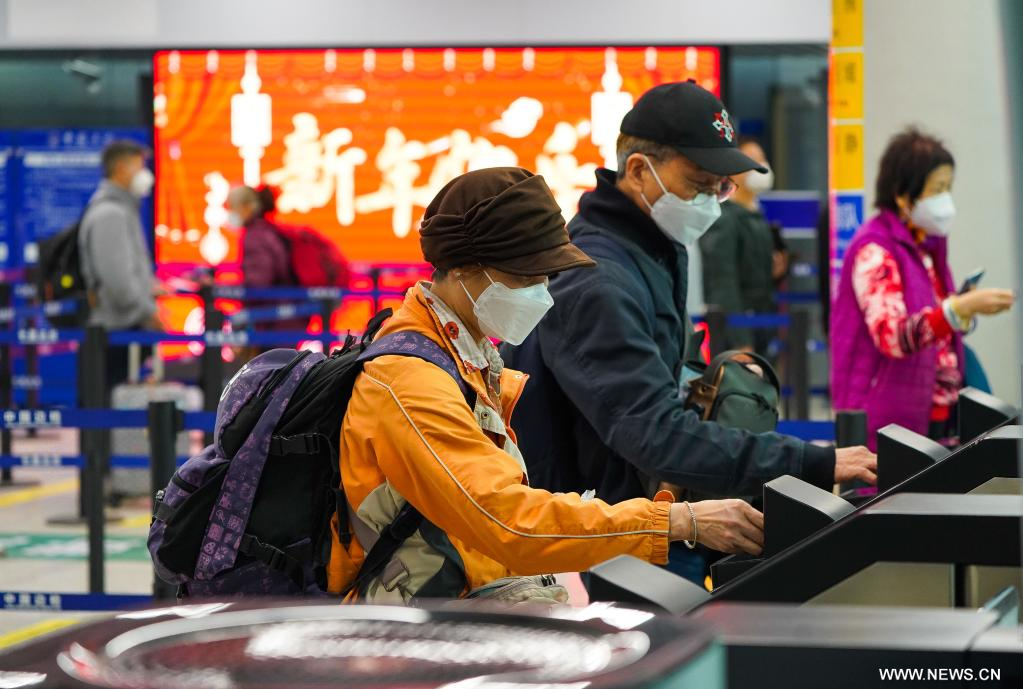 شنتشن 9 يناير 2023 (شينخوا) في الصورة الملتقطة يوم 8 يناير 2023، مسافرون يصلون إلى نقطة تفتيش "لوك ما تشاو" عبر السكك الحديدية للنقل الجماعي (ماس ترانزيت) في هونغ كونغ بجنوبي الصين.