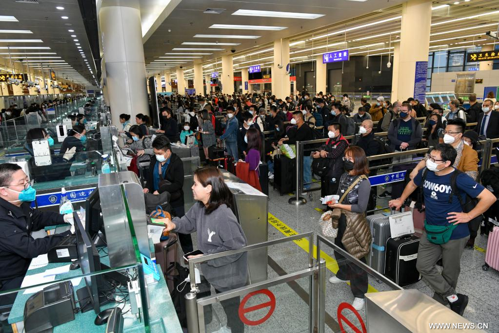 شنتشن 9 يناير 2023 (شينخوا) في الصورة الملتقطة يوم 8 يناير 2023، مسافرون قادمون من هونغ كونغ يصطفون في طوابير لدخول البر الرئيسي الصيني عند نقطة تفتيش "فوتيان" في جنوبي الصين.