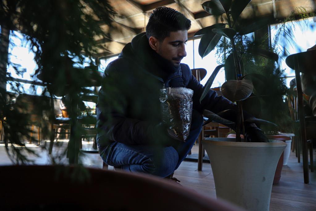 غزة 23 يناير 2023 (شينخوا) في الصورة الملتقطة يوم 19 يناير 2023، عبد الله الصفدي يستخدم رواسب القهوة كسماد للنباتات في مدينة غزة. يروج عبد الله الصفدي، شاب من غزة في العشرينات من عمره، لإعادة تدوير رواسب القهوة إلى سماد عضوي في مجتمعه.