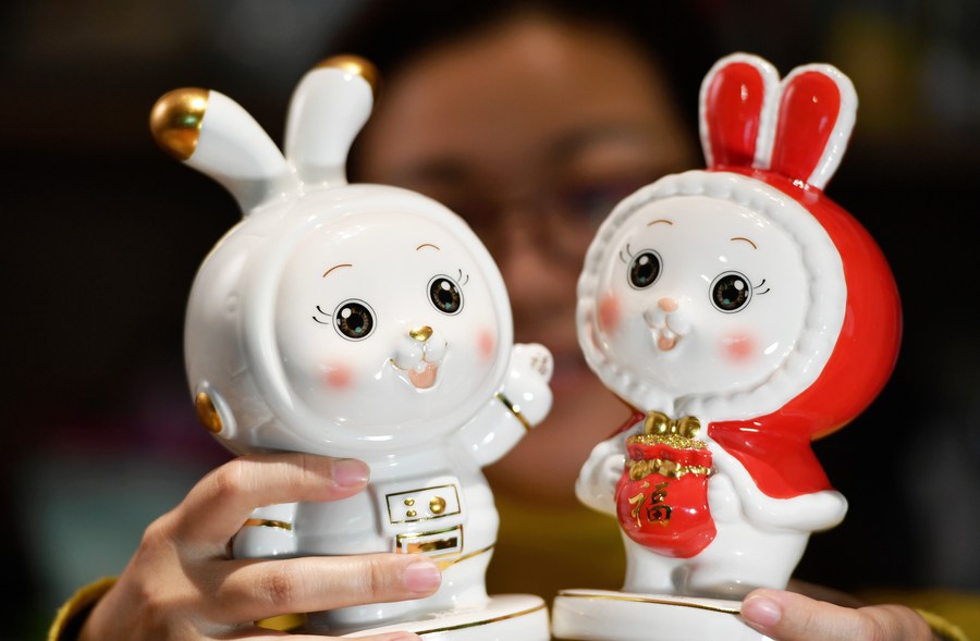 مواطنة تعرض أرانب مصنوعة من السيراميك تم إنتاجها في مصنع سيراميك في دههوا بمدينة تشوانتشو بمقاطعة فوجيان جنوب شرقي الصين يوم 23 يناير 2023. (شينخوا)