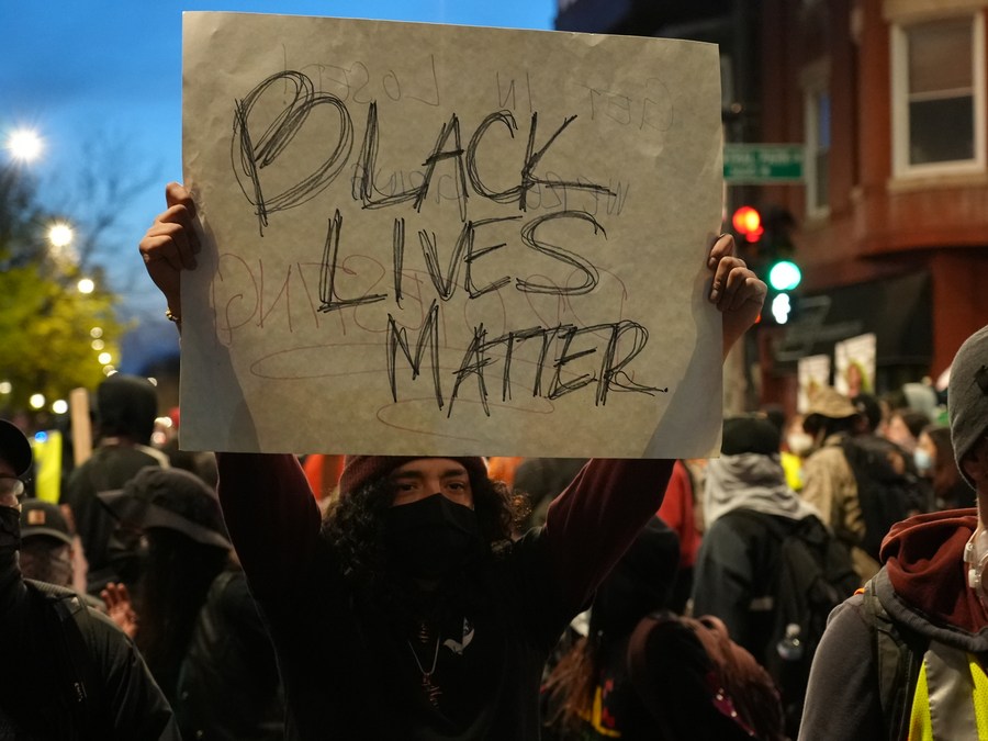 متظاهر يحمل لافتة خلال مظاهرة في شيكاغو، الولايات المتحدة يوم 16 أبريل 2021. تجمع مئات المتظاهرين في حديقة شمال غرب شيكاغو للاحتجاج على قتل الشرطة لآدم توليدو البالغ من العمر 13 عامًا يوم 29 مارس. (شينخوا)