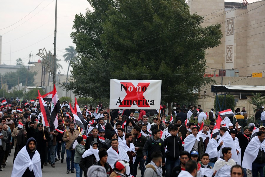 عراقيون يتظاهرون ضد وجود القوات الأمريكية في البلاد، في العاصمة العراقية بغداد، يوم 24 يناير 2020. (شينخوا)