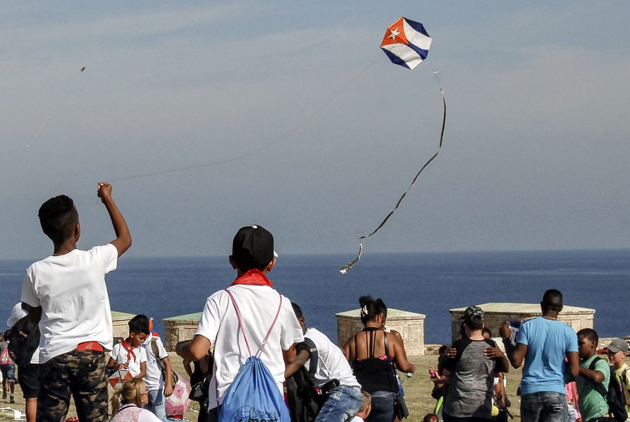 شخص يحمل طائرة ورقية ملونة مثل العلم الوطني الكوبي، خلال احتجاج على الحصار الاقتصادي للولايات المتحدة المفروض على كوبا، في ساحة قلعة مورو في هافانا، كوبا يوم 18 فبراير 2017. (شينخوا)