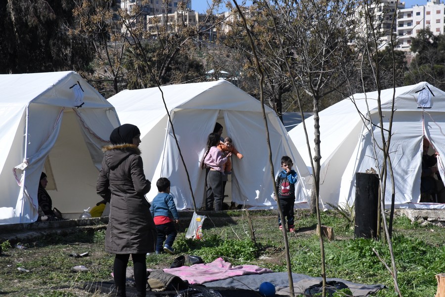 نازحون يقيمون في خيمة مؤقتة في حلب بسوريا في 15 فبراير 2023. (شينخوا)