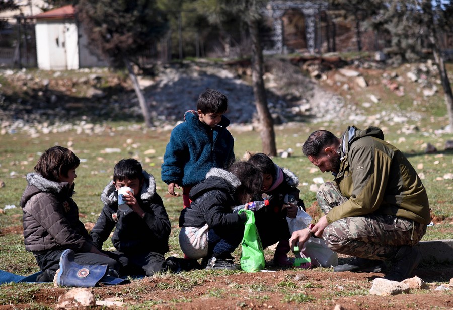 أطفال نازحون في حديقة عامة في حلب بسوريا في 16 فبراير 2023. (شينخوا)