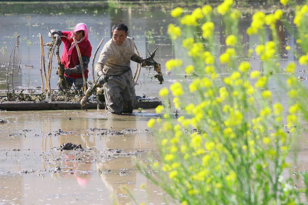 تشيويجينغ 18 فبراير 2023 (شينخوا) في الصورة الملتقطة يوم 18 فبراير 2023، مزارعان يغرسان جذور اللوتس في مدينة تشيويجينغ بمقاطعة يوننان جنوب غربي الصين. توافق بداية المطر، المعروف أيضا باسم "يويشوي"، اليوم الثاني من الأيام الشمسية الـ24 المحددة في التقويم القمري الصيني، يوم 19 فبراير من العام الجاري، وستشهد ارتفاعا في درجات الحرارة ومزيدا من الأمطار المتكررة وموجة من الأنشطة الزراعية الربيعية في جميع أنحاء الصين.