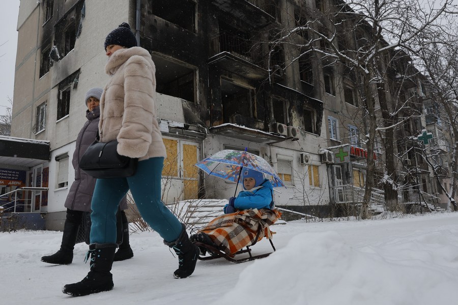 أشخاص يمرون بمبنى متضرر في ماريوبول يوم 18 فبراير 2023. (شينخوا)