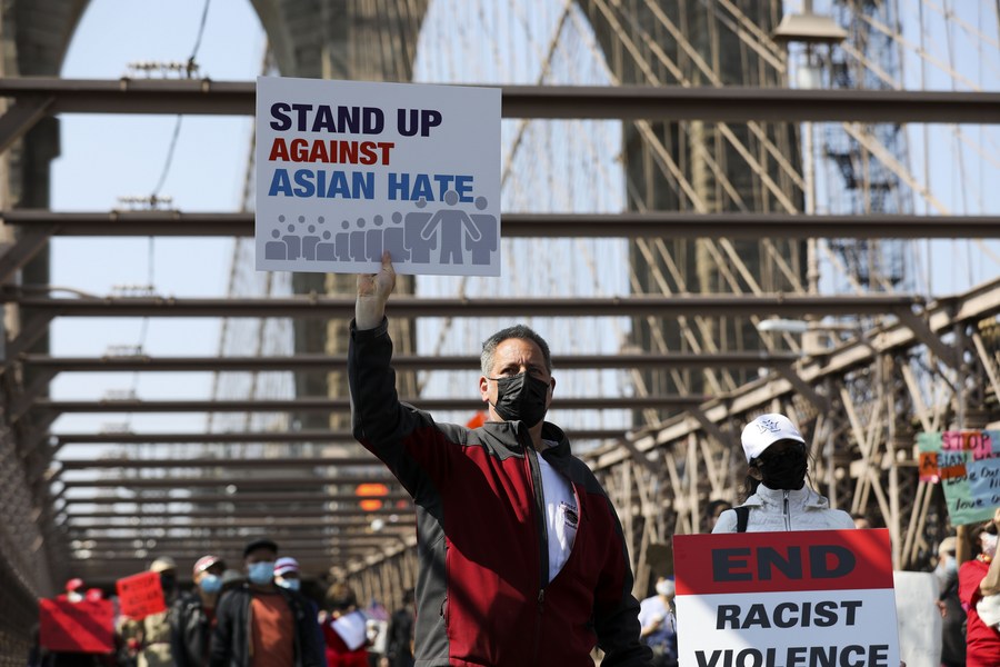 أناس يحتجون على جرائم الكراهية ضد الآسيويين على جسر بروكلين في نيويورك الولايات المتحدة يوم 4 أبريل 2021. نظمت مظاهرة ومسيرة كبيرة "وقف الكراهية ضد الآسيويين" هنا يوم الأحد. (شينخوا)