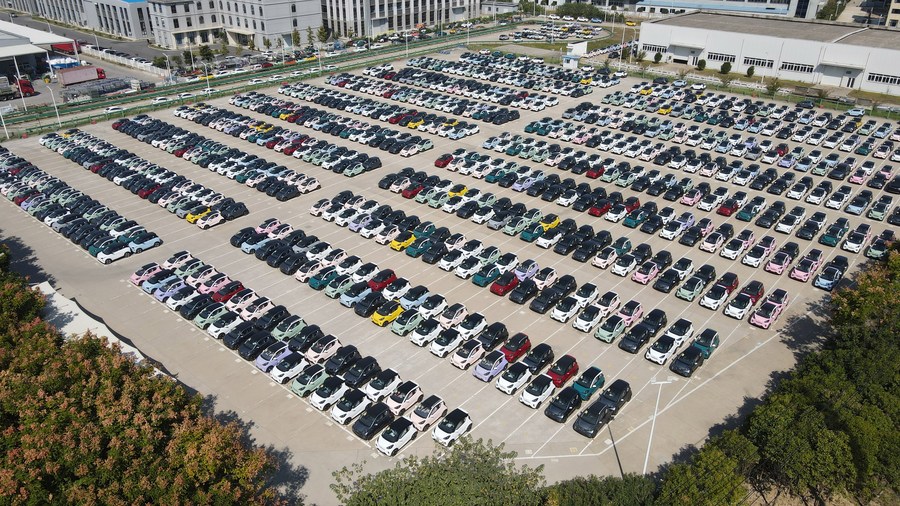 صورة ملتقطة من الجو في 12 أكتوبر 2022 تظهر سيارات تعمل بالطاقة الجديدة في أحد المصانع التابعة لشركة مجموعة "شيري" الصينية القابضة المحدودة لصناعة السيارات في مدينة ووهو بمقاطعة آنهوي بشرقي الصين. (شينخوا)
