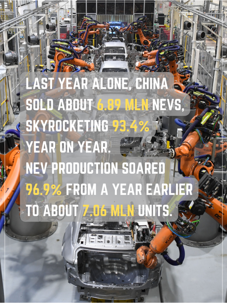 تُعد صناعة مركبات الطاقة الجديدة مثالاً جيدًا لذلك. ففي العام الماضي وحده، قامت الصين ببيع حوالي 6.89 مليون مركبة طاقة جديدة، بزيادة قدرها 93.4 بالمائة على أساس سنوي. وفي الوقت نفسه، ارتفع إنتاج مركبات الطاقة الجديدة بنسبة 96.9 بالمائة مقارنة العام السابق، ليصل إلى حوالي 7.06 مليون وحدة. كما بلغت الحصة السوقية لمركبات الطاقة الجديدة في سوق السيارات الصينية 25.6 بلمائة في 2022، بزيادة تُقدر بـ12.1 نقطة مئوية عن 2021.