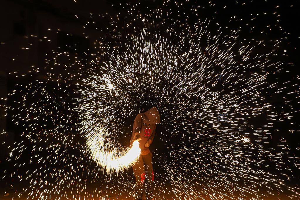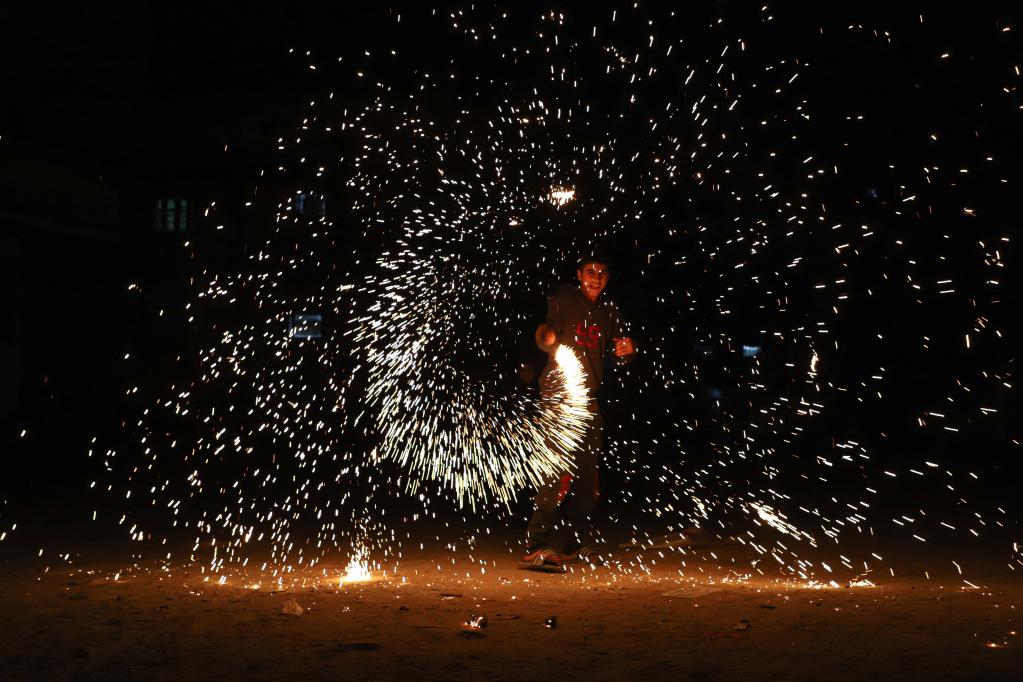 غزة 29 مارس 2023 (شينخوا) في الصورة الملتقطة يوم 28 مارس 2023، طفل فلسطيني يلعب بالألعاب النارية في مخيم الشاطئ للاجئين في مدينة غزة.