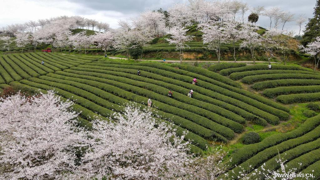 يويتشينغ 30 مارس 2023 (شينخوا) في الصورة الملتقطة يوم 29 مارس 2023، مزارعون يقطفون أوراق الشاي في بلدة سونغيان بمحافظة يويتشينغ في مقاطعة قويتشو بجنوب غربي الصين. ومع اعتدال الطقس تدريجيا خلال فصل الربيع، استقبلت مزارع الشاي بالمحافظة موسم الذروة لقطف أوراق الشاي.