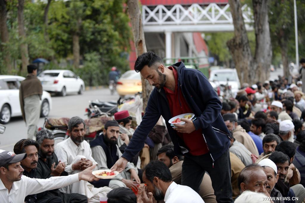إسلام آباد 7 أبريل 2023 (شينخوا) في الصورة الملتقطة يوم 6 أبريل 2023، متطوع يوزع وجبات إفطار خلال شهر رمضان في العاصمة الباكستانية إسلام آباد.