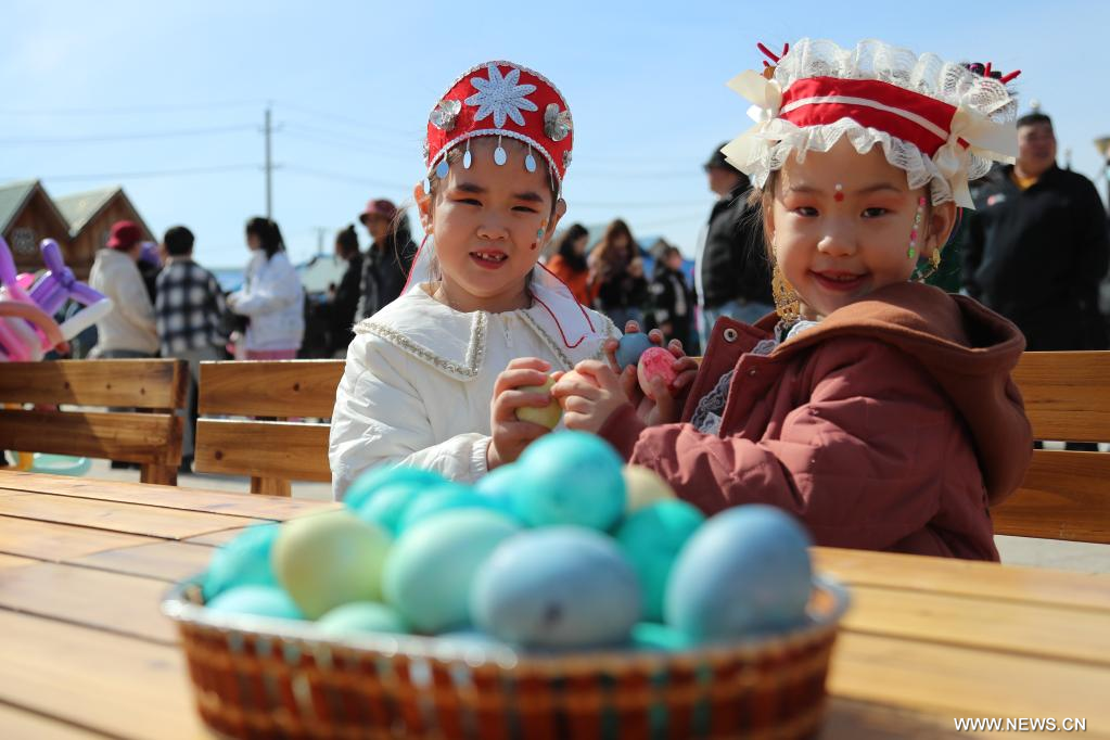هولون بوير 16 أبريل 2023 (شينخوا) في الصورة الملتقطة يوم 16 أبريل 2023، أشخاص من المجموعة القومية الروسية يلعبون لعبة نقر البيض التقليدية خلال الاحتفال بعيد القيامة الروسي في مركز قرى إنخه في هولون بوير في منطقة منغوليا الداخلية ذاتية الحكم شمالي الصين. أُدرج عيد القيامة الروسي، الذي يحتفل به أفراد المجموعة القومية الروسية، على أنه تراث ثقافي وطني غير مادي للصين، حيث تقام المهرجانات والأنشطة المختلفة خلال هذا الاحتفال الذي يستمر لمدة أسبوع.