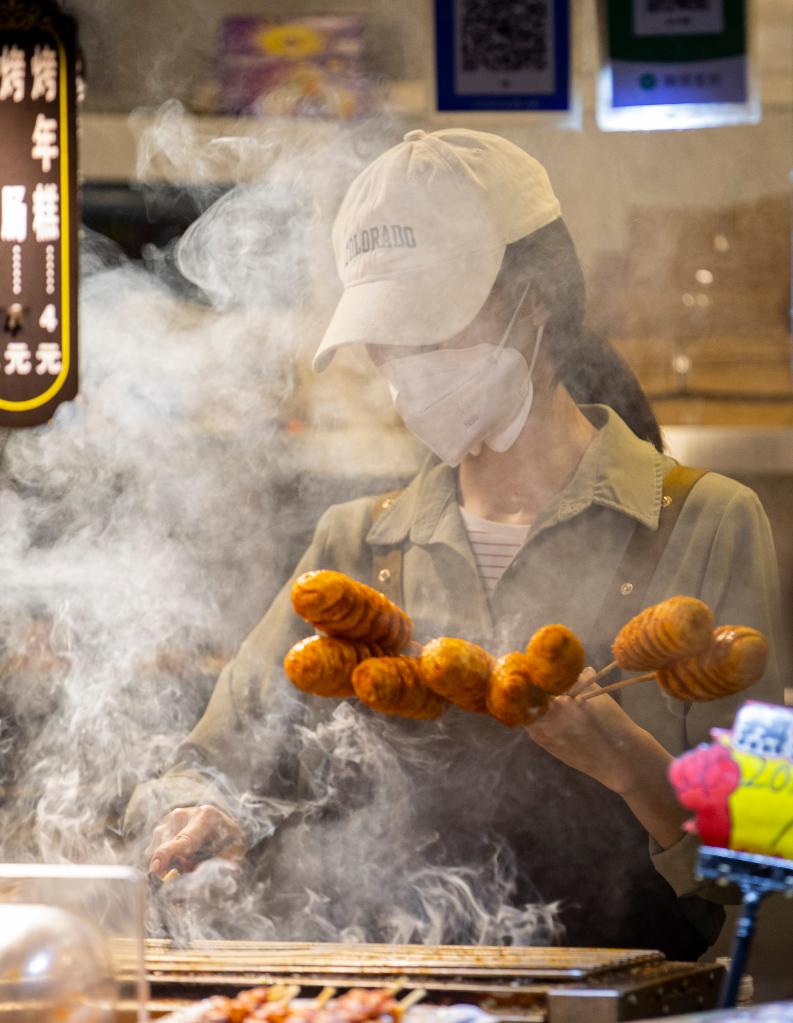 يينتشوان 3 مايو 2023 (شينخوا) في الصورة الملتقطة يوم 2 مايو 2023، بائعة تطبخ الوجبات الخفيفة في سوق في ناحية جينفنغ في يينشتوان بمنطقة نينغشيا ذاتية الحكم لقومية هوي شمال غربي الصين. تبذل يينتشوان الجهود لتعزيز اقتصادها الليلي في السنوات الأخيرة.