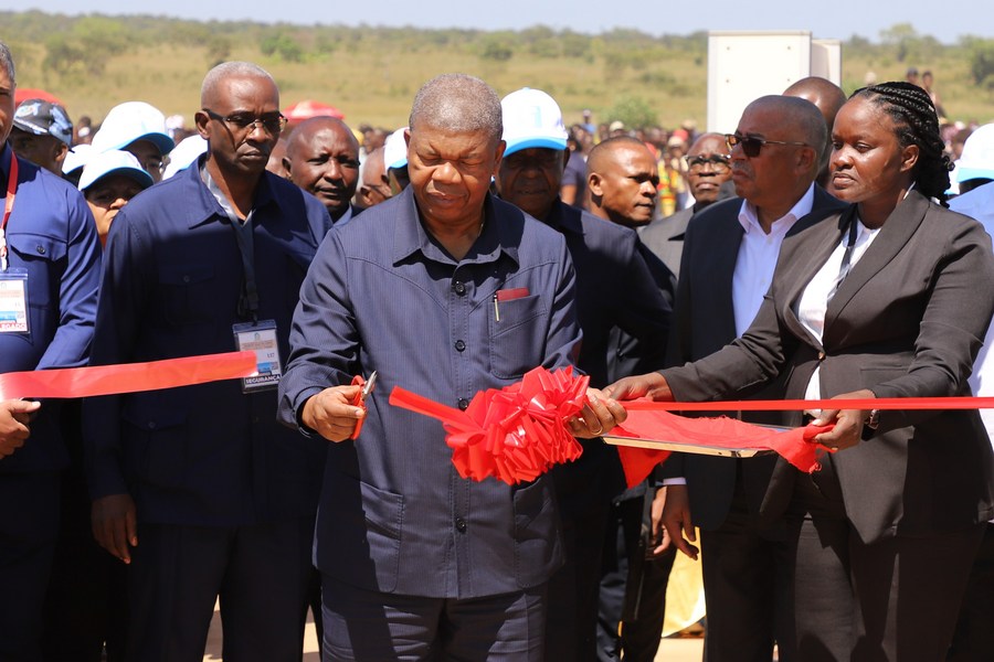 الرئيس الأنغولي جواو لورينكو وهو يقطع الشريط أثناء حضوره حفل تسليم مشروع تعزيز نظام إمدادات المياه الذي بنته الصين في مقاطعة مالانجي بشمال أنغولا في 12 مايو 2023. (شينخوا)