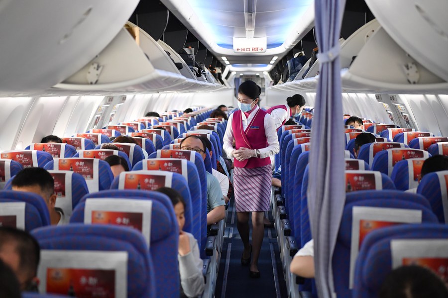 مضيفات الطيران تتحققن من إجراءات السلامة قبيل إقلاع أول رحلة ركاب على مسار شيآن-أورومتشي-عشق آباد في شيآن، حاضرة مقاطعة شنشي شمال غربي الصين يوم 13 مايو 2023. (شينخوا)