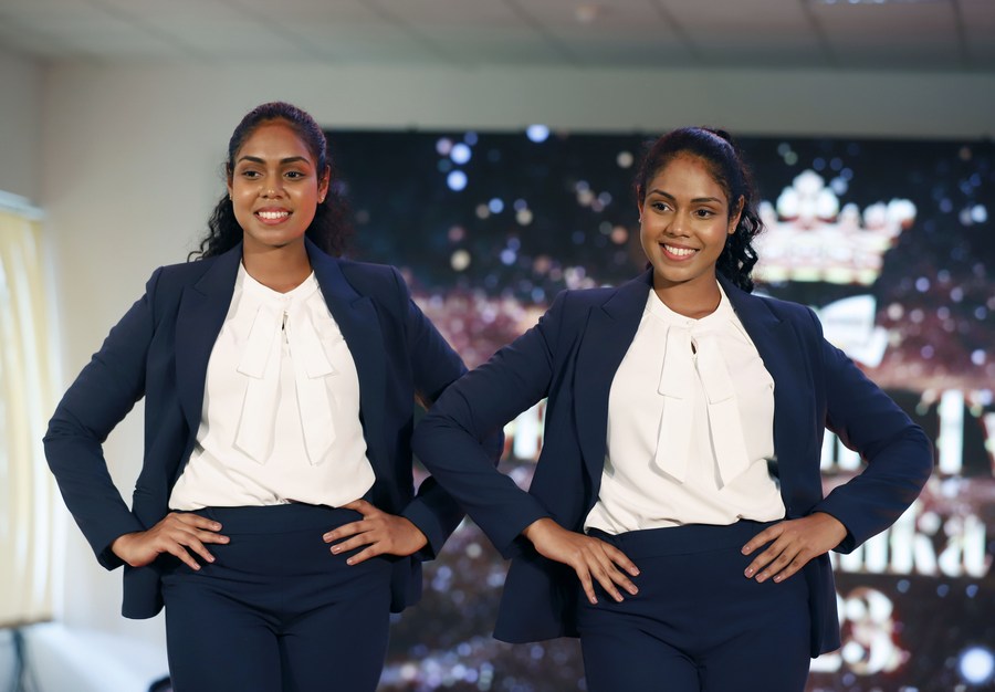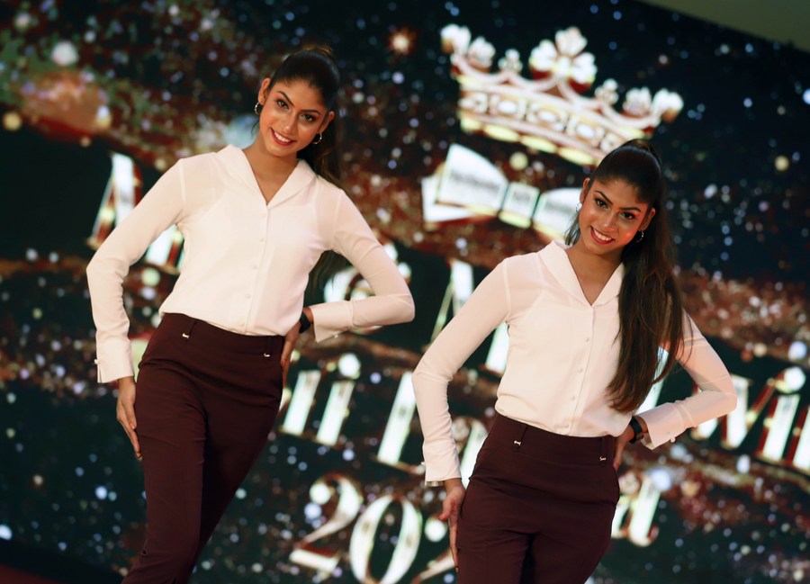 متسابقتان تشاركان في مسابقة أجمل توأم سيدات في كولومبو بسريلانكا يوم 20 مايو 2023. (شينخوا)