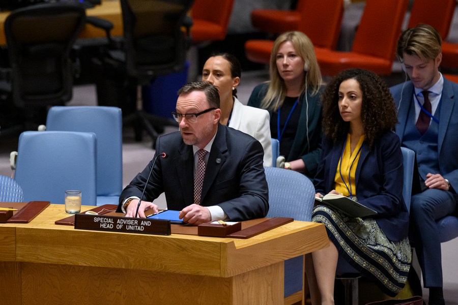 كريستيان ريتشر (في الأمام) رئيس فريق التحقيقات التابع للأمم المتحدة لتعزيز المساءلة عن الجرائم التي ارتكبتها داعش/تنظيم الدولة الإسلامي، يتحدث في اجتماع مجلس الأمن التابع للأمم المتحدة في مقر الأمم المتحدة بنيويورك، يوم 7 يونيو 2023. (صورة الأمم المتحدة/نُشر عبر شينخوا)