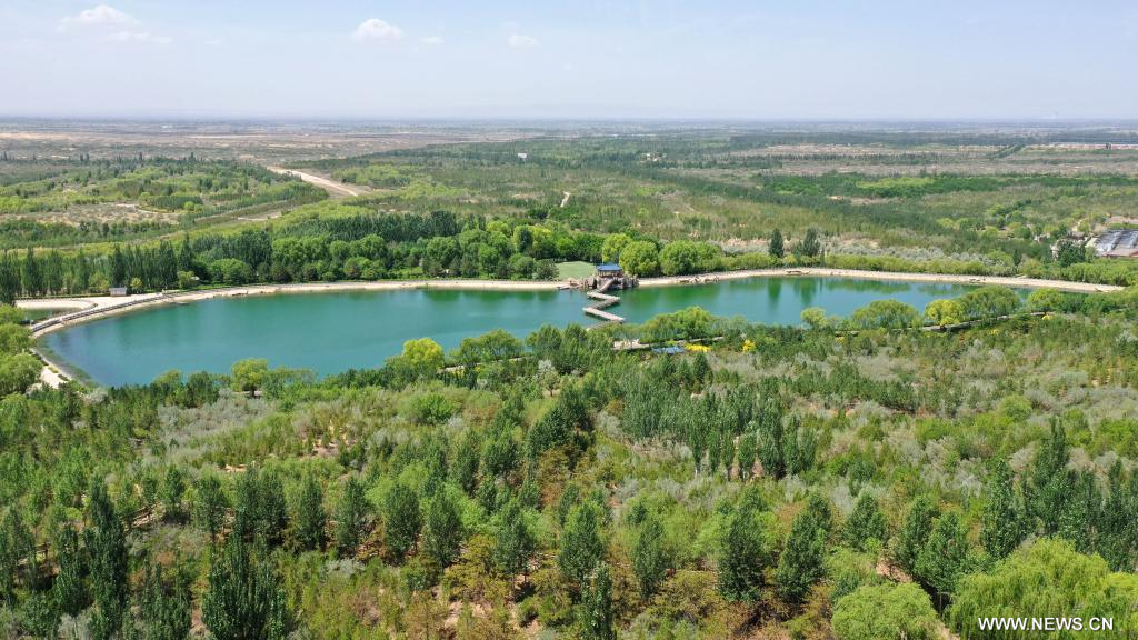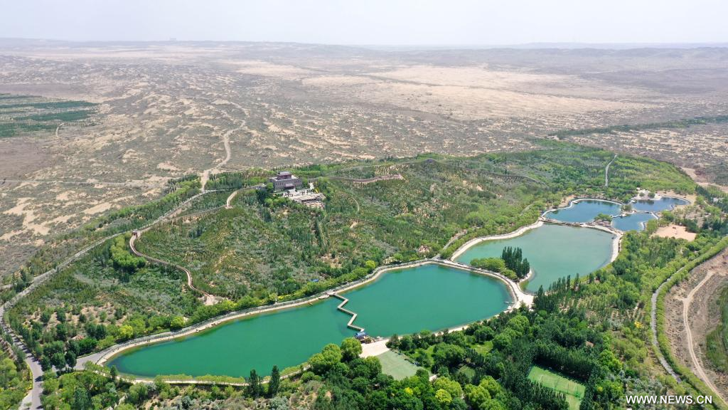ينتشوان 9 يونيو 2023 (شينخوا) في الصورة الملتقطة يوم 7 يونيو 2023 ، منظر جوي لمحمية بايجيتان الطبيعية الوطنية بمدينة لينغوو، التي تقع في حدود صحراء مو أوس، في منطقة نينغشيا الذاتية الحكم لقومية هوي في شمال غربي الصين. وقد شهدت المدينة منذ عام 1953 جهودا دؤوبة بين أجيال عديدة لزراعة الأشجار ومكافحة التصحر، حتى بناء "ممر أخضر" يضمن الأمن الإيكولوجي المحلي، يمتد طوله 60 كم من الشمال إلى الجنوب وعرضه يتراوح بين 20 و30 كم من الشرق إلى الغرب في جنوب غربي صحراء مو أوس .