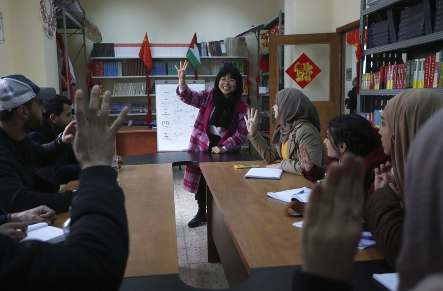 معلمة صينية تتحدث مع الطلاب الفلسطينيين في معهد كونفوشيوس بجامعة القدس في مدينة رام الله بالضفة الغربية، 22 فبراير 2020. (شينخوا)