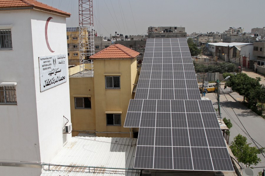 تُظهر الصورة الملتقطة في 7 أبريل 2021 لوحات الطاقة الشمسية، التي مولتها الصين، وقد تم تركيبها في مستشفى للأطفال بمدينة غزة. (شينخوا)