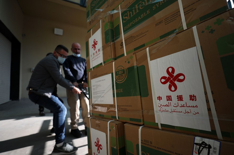 عمال ينقلون دفعة من لقاح سينوفارم المضاد لكوفيد-19 في قرية سالم شرق مدينة نابلس بالضفة الغربية، 29 مارس 2021. قامت الصين بتسليم فلسطين دفعة متبرع بها من لقاح سينوفارم المضاد لكوفيد-19 لدعم مكافحتها للجائحة على مستوى البلاد. (شينخوا)