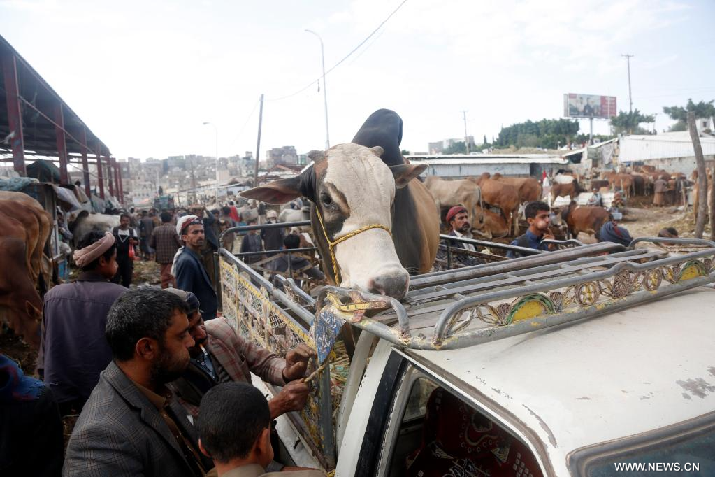 صنعاء 26 يونيو 2023 (شينخوا) في الصورة الملتقطة يوم 25 يونيو 2023، أشخاص يتسوقون في سوق للماشية قبل عيد الأضحى في العاصمة اليمنية صنعاء.
