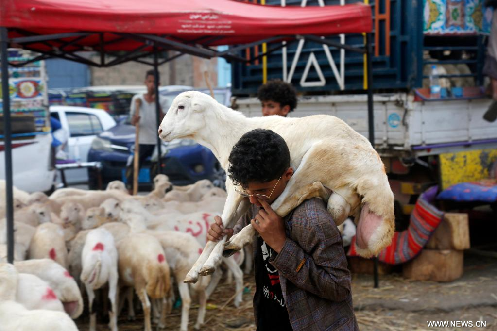 صنعاء 26 يونيو 2023 (شينخوا) في الصورة الملتقطة يوم 25 يونيو 2023، صبي يحمل شاة في سوق للماشية قبل عيد الأضحى في العاصمة اليمنية صنعاء.