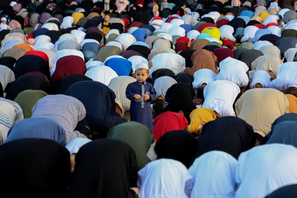 في الصورة الملتقطة يوم 28 يونيو 2023، طفل فلسطيني بين المصلين في صلاة عيد الأضحى في مدينة غزة.