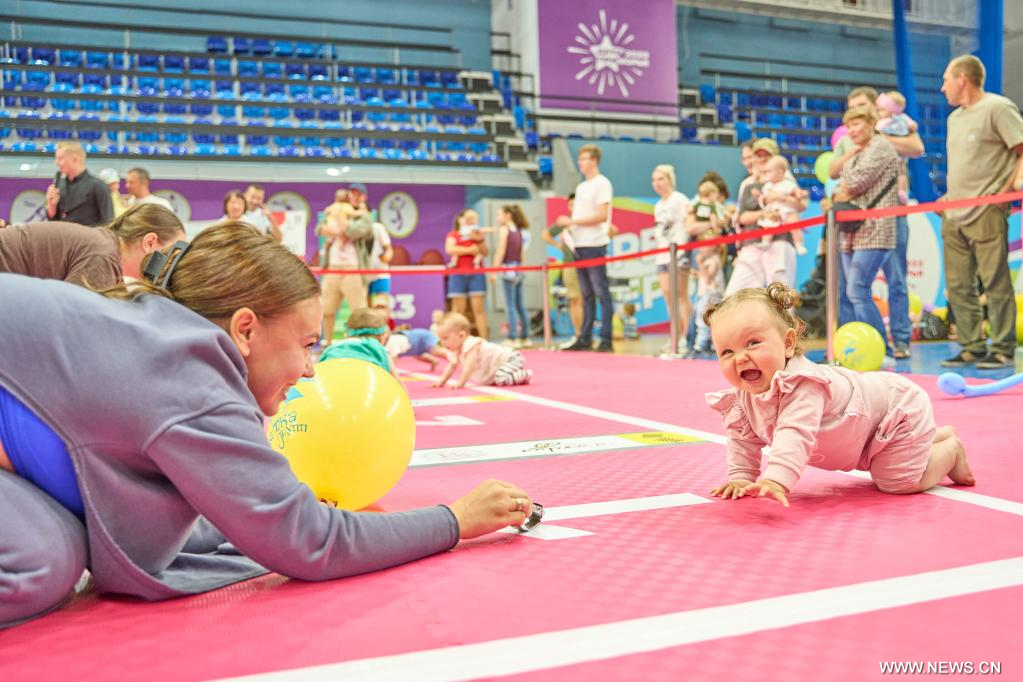 فلاديفوستوك 9 يوليو 2023 (شينخوا) في الصورة الملتقطة يوم 8 يوليو 2023، طفلة رضيعة تشارك في سباق زحف الأطفال في مدينة فلاديفوستوك الروسية. ويوافق 8 يوليو يوم الأسرة والحب والإخلاص في روسيا. وعقد السباق في مدينة فلاديفوستوك بالشرق الأقصى الروسي احتفالا بهذه المناسبة.