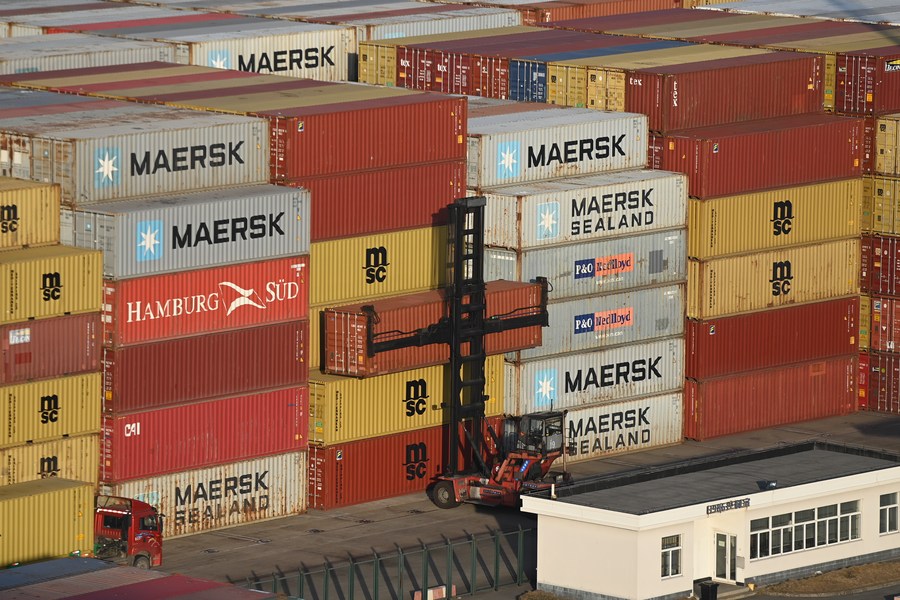 في الصورة الملتقطة يوم 31 يناير 2023، محطة حاويات في ميناء نينغبوه تشوشان في مقاطعة تشجيانغ شرقي الصين. (شينخوا)