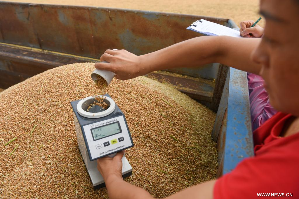 ينتشوان 11 يوليو 2023 (شينخوا) في الصورة الملتقطة يوم 10 يوليو 2023، مزارع يقيس مستوى الرطوبة بمحصول القمح في مدينة شيتسويشان بمنطقة نينغشيا الذاتية الحكم لقومية هوي في شمال غربي الصين، حيث يسابق المزارعون المحليون الزمن لحصاد القمح الصيفي مع حلول موسم الحصاد.