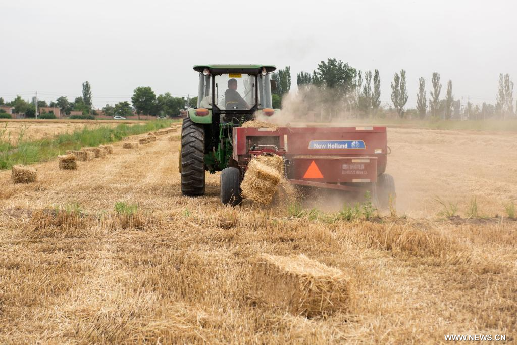 ينتشوان 11 يوليو 2023 (شينخوا) في الصورة الملتقطة يوم 10 يوليو 2023، مزارع يقود آلة زراعية لجمع قش القمح في مدينة شيتسويشان بمنطقة نينغشيا الذاتية الحكم لقومية هوي في شمال غربي الصين، حيث يسابق المزارعون المحليون الزمن لحصاد القمح الصيفي مع حلول موسم الحصاد.