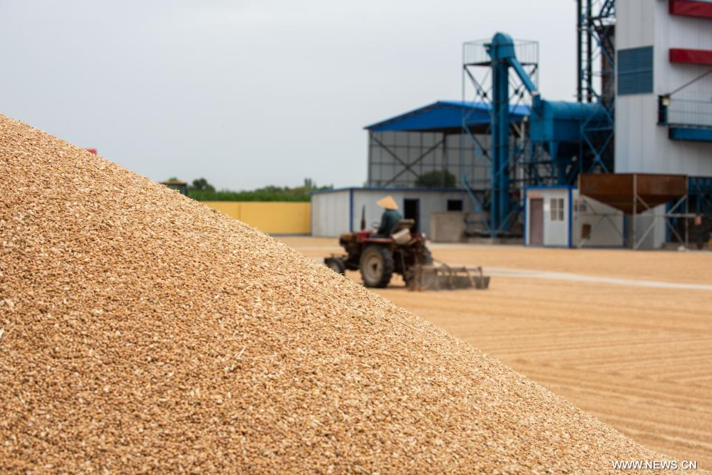 ينتشوان 11 يوليو 2023 (شينخوا) في الصورة الملتقطة يوم 10 يوليو 2023، مزارع يجفف محصول القمح في مدينة شيتسويشان بمنطقة نينغشيا الذاتية الحكم لقومية هوي في شمال غربي الصين، حيث يسابق المزارعون المحليون الزمن لحصاد القمح الصيفي مع حلول موسم الحصاد.