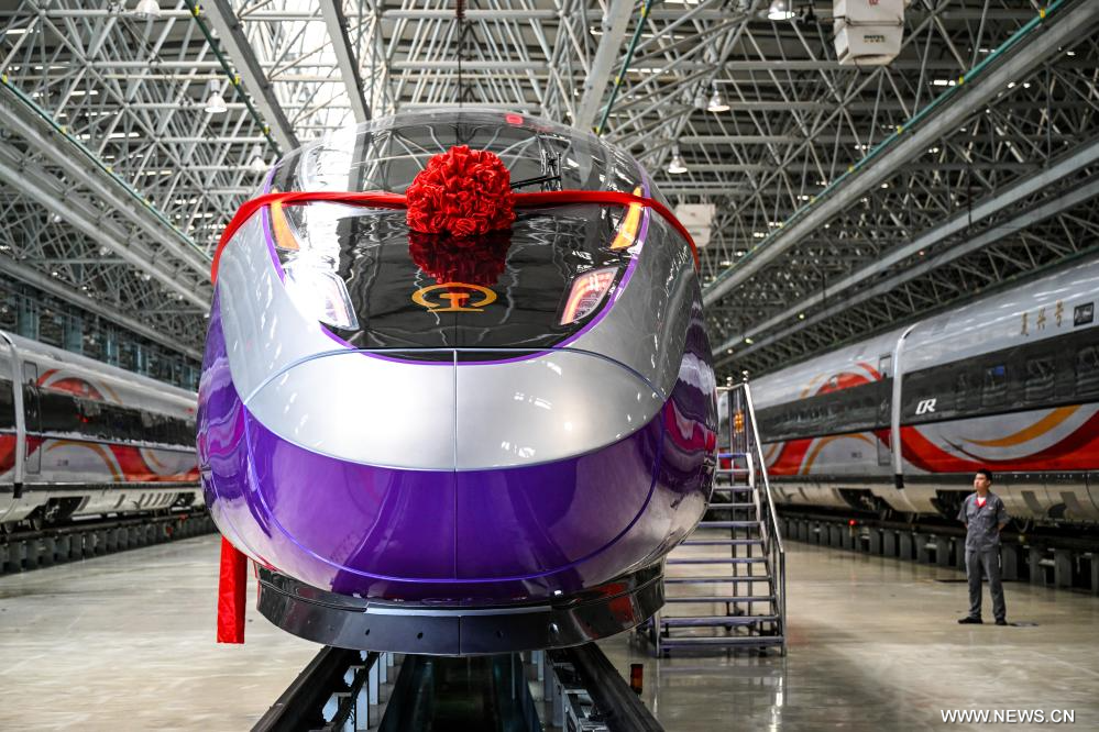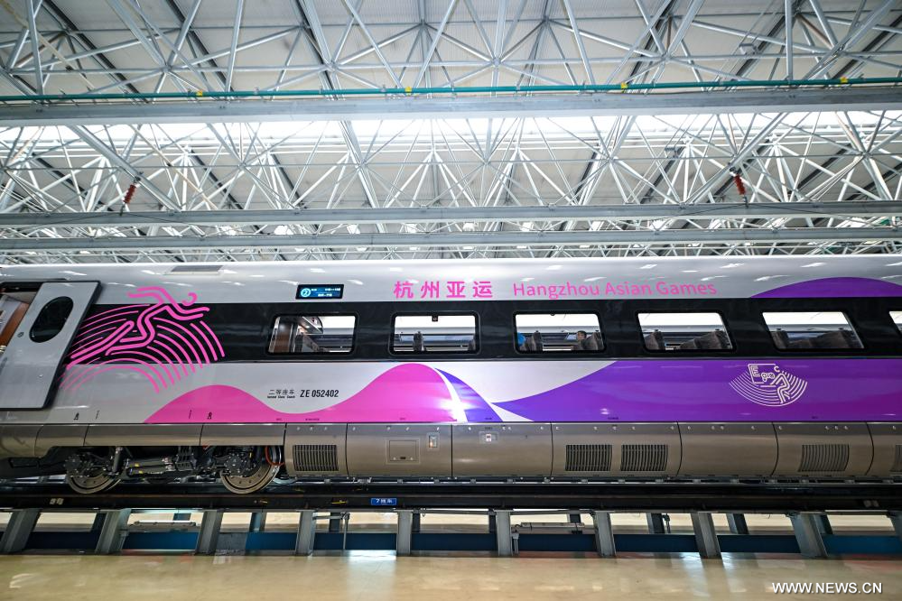 تشانغتشون 21 يوليو 2023 (شينخوا) في الصورة الملتقطة يوم 21 يوليو 2023، مشهد خارجي لقطار فوشينغ الطلقة المصمم خصيصا لدورة الألعاب الآسيوية في هانغتشو في تشانغتشون بمقاطعة جيلين شمال شرقي الصين. خرج القطار من خط الإنتاج في تشانغتشون اليوم (الجمعة).