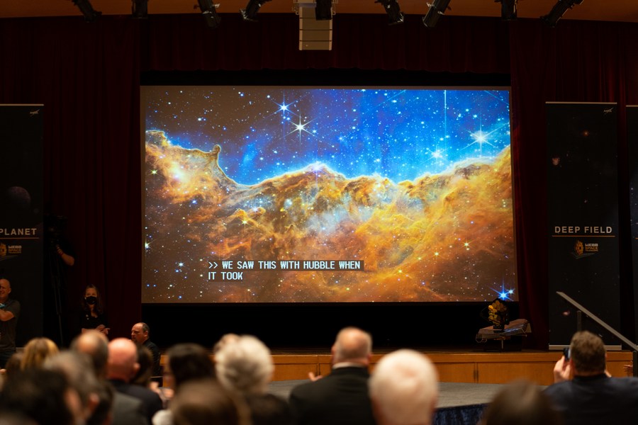 صورة تم التقاطها بواسطة تلسكوب جيمس ويب الفضائي التابع لناسا لمنطقة تشكل النجوم المسماة أن جي سي 3324 في سديم كارينا تظهر على شاشة في مركز غودارد لرحلات الفضاء النابع لناسا في غرينبيلت، ولاية ماريلاند، الولايات المتحدة، في 12 يوليو 2022. (ناسا/نشر عبر شينخوا)