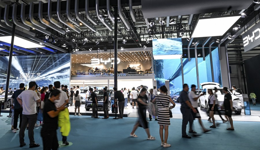 أشخاص يزورون جناح شركة "بي واي دي" للسيارات خلال معرض تشانغتشون الدولي العشرين للسيارات في تشانغتشون، عاصمة مقاطعة جيلين بشمال شرق الصين، في 20 يوليو 2023. (شينخوا)