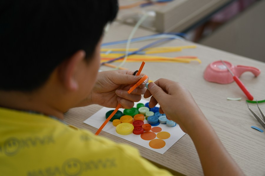 وانغ لينجيانغ، كبير الحرفيين في ورشة ثقافية وإبداعية، يلف شرائط الورق في حي ونجيانغ، تشنغدو، مقاطعة سيتشوان جنوب غرب الصين، في 5 يوليو 2023. (شينخوا)