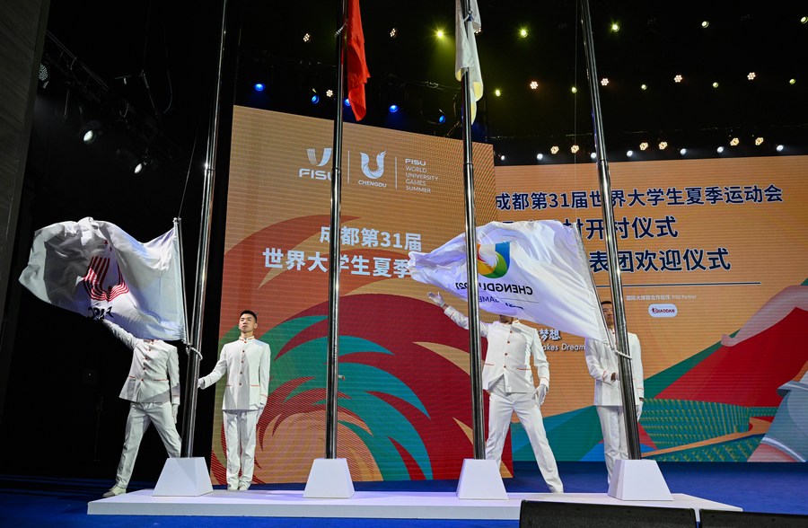 تُظهر الصورة الملتقطة في 22 يوليو 2023 مراسم رفع العلم خلال حفل افتتاح قرية الرياضيين التي تستضيف دورة الألعاب الجامعية العالمية في مدينة تشنغدو في مدينة تشنغدو بمقاطعة سيتشوان جنوب غرب الصين. (شينخوا)