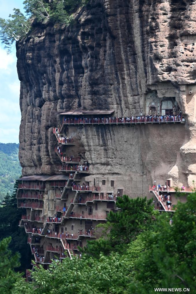 تيانشوي 31 يوليو 2023 (شينخوا) في الصورة الملتقطة يوم 30 يوليو 2023، سياح يزورون كهوف مايجيشان في مدينة تيانشوي بمقاطعة قانسو شمال غربي الصين. وتم نحت كهوف مايجيشان التي يبلغ عمرها أكثر من 1600 عام، في كهوف بقمة جبل معزول على طريق الحرير القديم في مدينة تيانشوي. وخلال الموسم الصيفي للسياحة، تم توفير مسارين مؤقتين للسياح لمشاهدة الكهوف خلال الفترة من 29 يوليو الجاري إلى 25 أغسطس القادم.