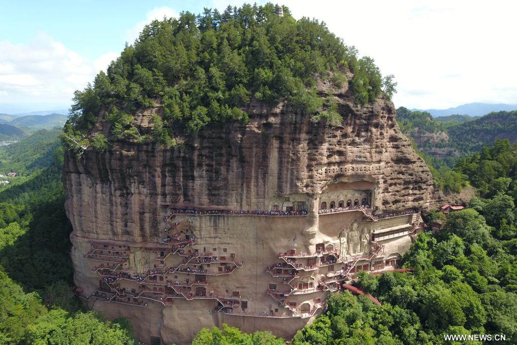 تيانشوي 31 يوليو 2023 (شينخوا) في الصورة الملتقطة جوا يوم 29 يوليو 2023، مشهد لكهوف مايجيشان في مدينة تيانشوي بمقاطعة قانسو شمال غربي الصين. وتم نحت كهوف مايجيشان التي يبلغ عمرها أكثر من 1600 عام، في كهوف بقمة جبل معزول على طريق الحرير القديم في مدينة تيانشوي. وخلال الموسم الصيفي للسياحة، تم توفير مسارين مؤقتين للسياح لمشاهدة الكهوف خلال الفترة من 29 يوليو الجاري إلى 25 أغسطس القادم.