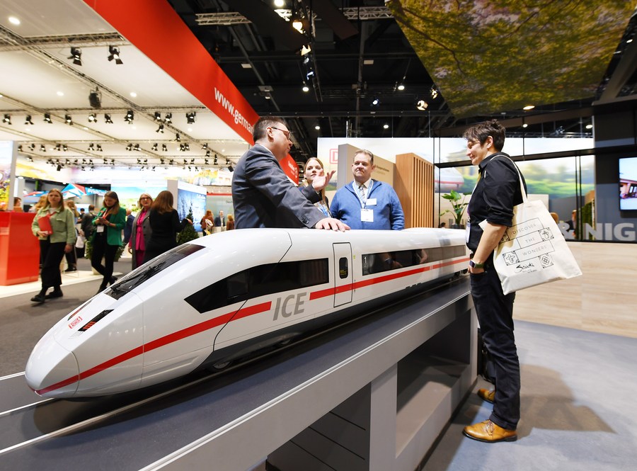 أشخاص يتحدثون في جناح دويتشه بان خلال معرض برلين الدولي للسياحة في برلين بألمانيا يوم 7 مارس 2023. (شينخوا)
