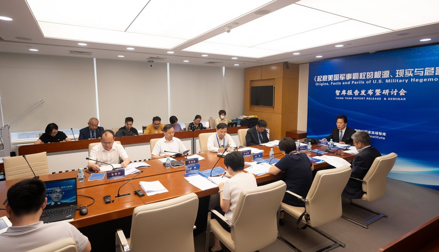 أصدر معهد ((شينخوا))، وهو مركز الأبحاث التابع لوكالة أنباء ((شينخوا))، تقريرا حول "جذور وحقائق ومخاطر" الهيمنة العسكرية الأمريكية وعقد ندوة عن هذا الموضوع في بكين، 5 سبتمبر 2023. (شينخوا)